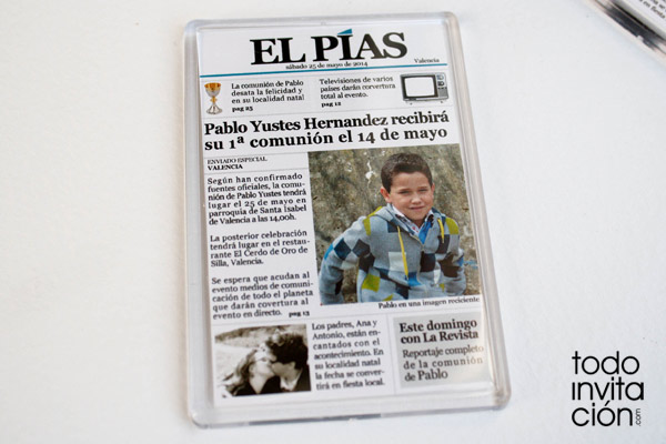 Presentado en forma de imán con la portada de periódico, redactado a la manera de la presa «seria» donde la noticia del día es la celebración del evento, personalizado con todos los datos y la foto del protagonista.