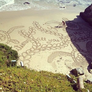 En la nieve, en la playa, en el campo, en el patio de tu casa… cualquier suelo es bueno para escribir «Cásate conmigo». Sólo procura que esté limpio y que la escritura sea clara y sencilla. Puedes añadir algún dibujillo e incluso utilizar palos o piedras para tu pregunta. Y si unes tu pedida con un maravilloso fin de semana en las montañas o una vuelta en helicóptero mejor que mejor.