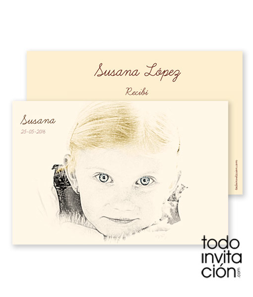 Una increíble invitación como si un autentico retrato a lápiz realizado por un gran artista se tratara. Es un efecto de diseño, pero parece realmente que un artista lo ha realizado a mano. Una invitación increíble, elegante y preciosa. Su precio va de 1,10€ a 1,95€ dependiendo de cantidad. Encarga tu invitación de comunión retrato lápiz