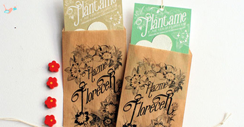 Dentro de una bolsa Kraft impresa con la frase “hazme florecer” encontrarás un corazón de papel de semillas de flores sobre una tarjeta impresa con el nombre y la fecha del evento. Viene en diferentes colores y es ideal para bautizos celebrados en primavera.