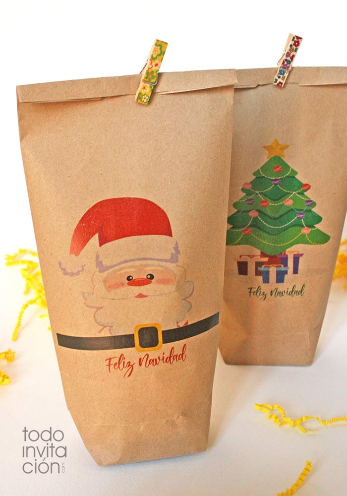 - Una original bolsa de kraft de hacer aun mas bonitos tus regalos y detalles de navidad . Surtido de 5 unidades con 3 diseños distintos muy navideños (2 de papa Noel + 2 de Rudolf + 1 arbol de navidad)