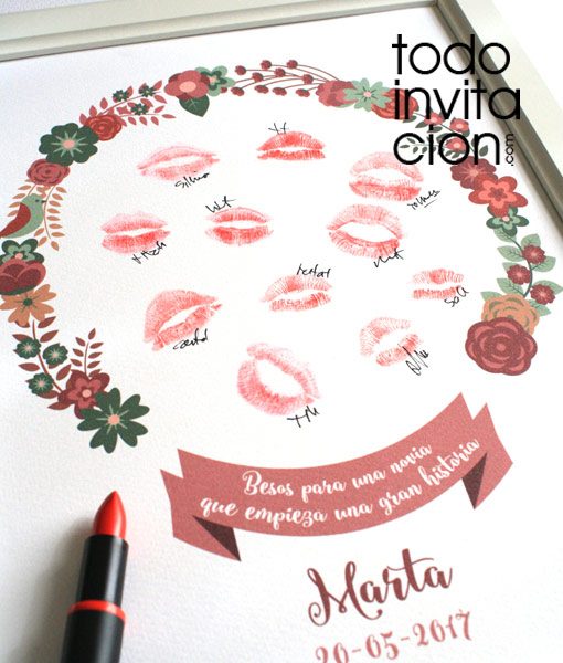 - Set completo de cuadro de huellas para despedidas de soltera «Flores» para que las invitadas a tu fiesta dejen su beso y su firma. El set se entrega listo para colocar en el evento. De 5 a 30 besos aproximadamente. Una forma original y divertida de que tus invitadas dejen su recuerdo en el día de tu despedida. Un precioso cuadro para colgar en tu casa y no 0lvidar aquel precioso día.