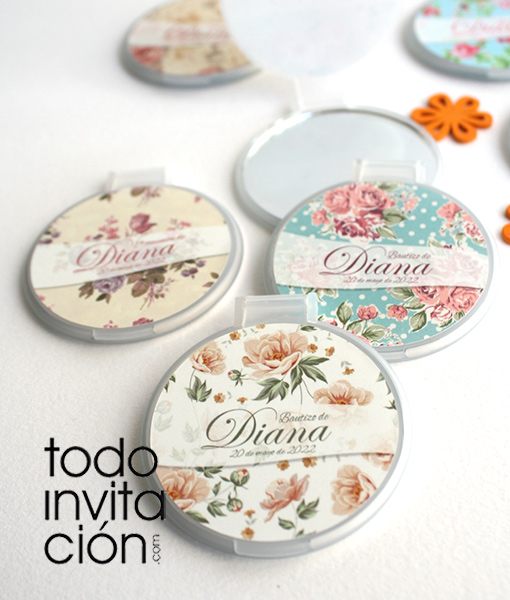 - Espejos de bolso personalizados y con tapa con 10 diseños florales surtidos en tu pedido. Un regalo perfecto para recordar tu preciosa despedida de soltera. Los espejos tienen tapa y van personalizados con el nombre y la fecha que nos indiques; están hechos en PVC y miden 6 cm de diámetro y 0,5 cm de altura. Superfinos y comodísimos para llevarlos en el bolso.