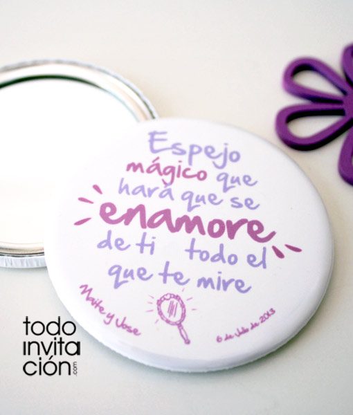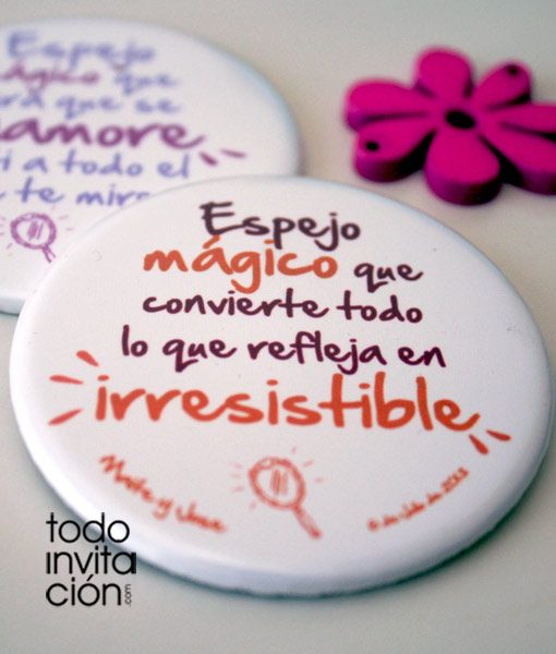 - Espejos increíbles para tu boda, llenos de frases que les encararán a tus invitadas. Un detalle original y divertido. Espejos mágicos para tu boda de 5,90 cm de diámetro con 5 mensajes diferentes llenos de alegría para que a las invitadas de tu boda les ocurran cosas increíbles cada vez que se miren en ellos.
