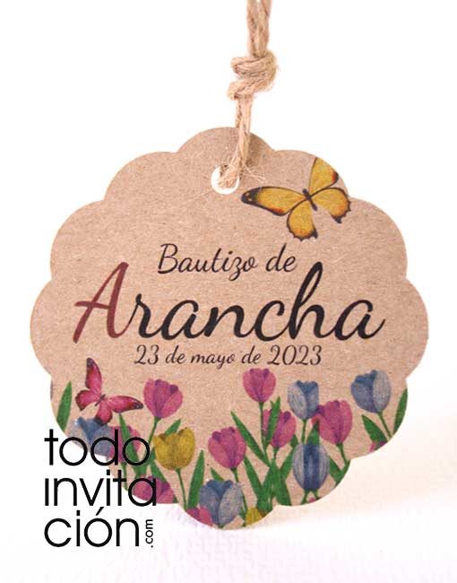 - Pack de 24 etiquetas de kraft (300 gr) redondas de 6 cm de diámetro impresas a color personalizadas con el texto que desees poner (nombres, fecha, gracias…) perfecto para cualquier evento. Incluyen cuerda de yute.