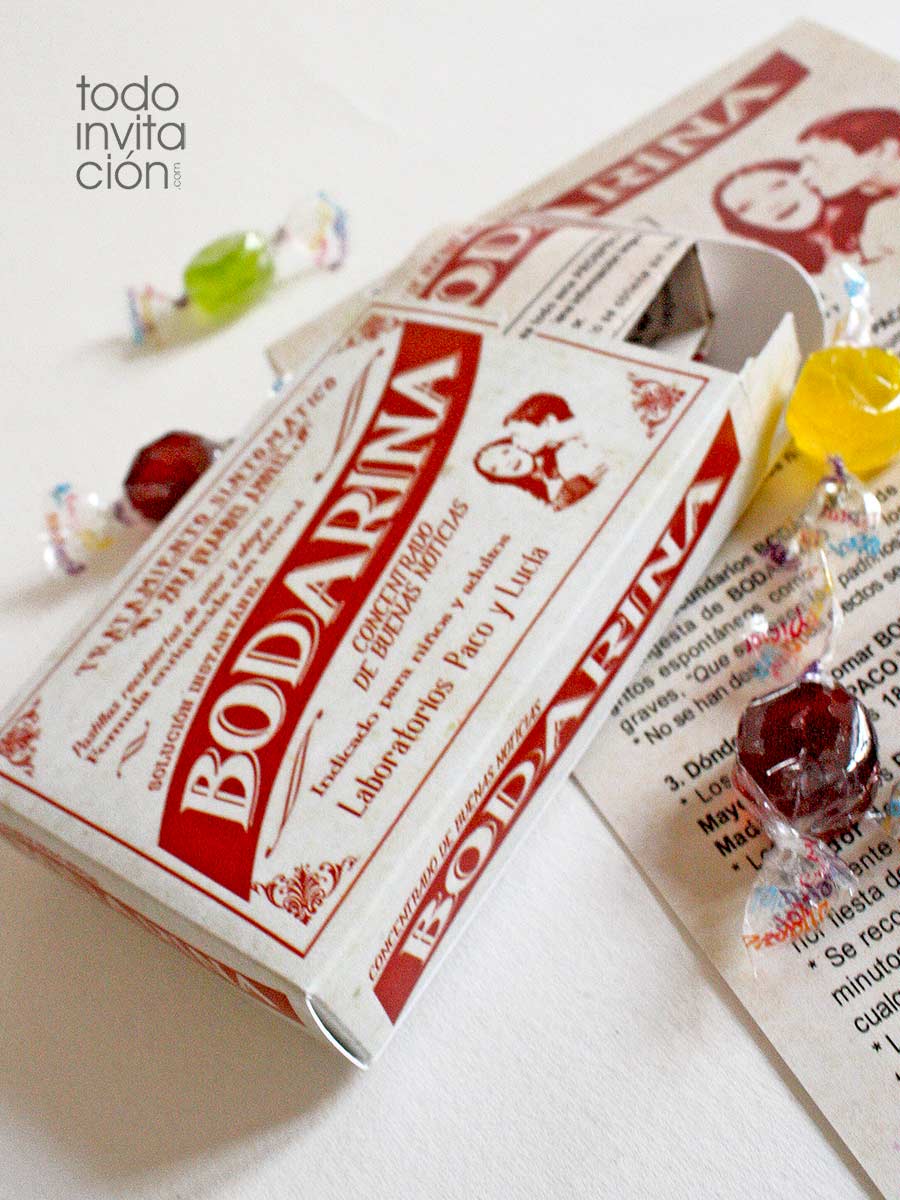- Una invitación de boda original, divertida y muy dulce. Caja de medicamento «BODARINA» al estilo de un medicamento antiguo. Personalizada con vuestra foto y todos vuestros datos y acompañada de caramelos de frutas. Todos los datos personales del evento, fecha, horarios, teléfonos etc… se incluyen en un divertidísimo prospecto donde se indica todo lo que hay que tener en cuenta para consumir tan original medicamento que en una boda divertida no va a poder faltar.