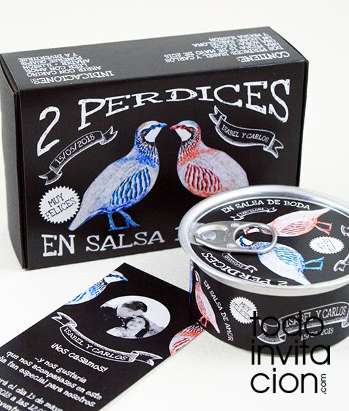 - Una invitación de boda tremendamente original, divertida y muy sabrosa. «2 Perdices muy felices en salsa de amor»Al estilo de las ricas conservas artesanales. Personalizada con vuestros datos en el exterior de la caja y en la lata de conservas donde se esconde un pequeño pergamino interior con el texto que nos envíes y vuestra foto. La lata se envía cerrada para que tus invitados la abran y descubran su rico contenido.