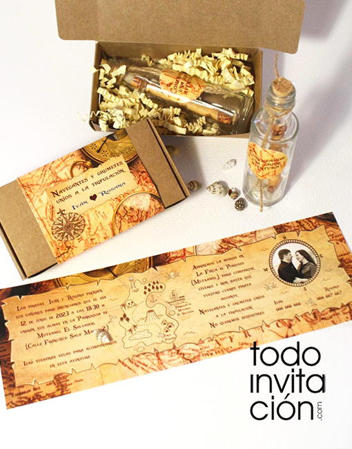 - Una invitación de boda muy original. ¡Mensaje en una botella como un mapa del tesoro pirata 🏴☠! Si sois aventureros e intrépidos y tenéis alma pirata esta invitación os va como anillo al dedo. Un mensaje tipo pergamino ha llegado en una botella cruzando el planeta con el mejor mensaje del mundo: ¡vuestra boda! En el interior de la botella un mensaje enrollado con los datos que vosotros nos enviéis redactado al estilo navegante con un mapa del tesoro con los pasos a seguir por vuestro invitados el día del enlace. Todo ello presentado con arena y conchas de mar dentro en una elegante cajita de kraft personalizada. El mapa del tesoro tiene un destino muy claro: VUESTRA BODA.