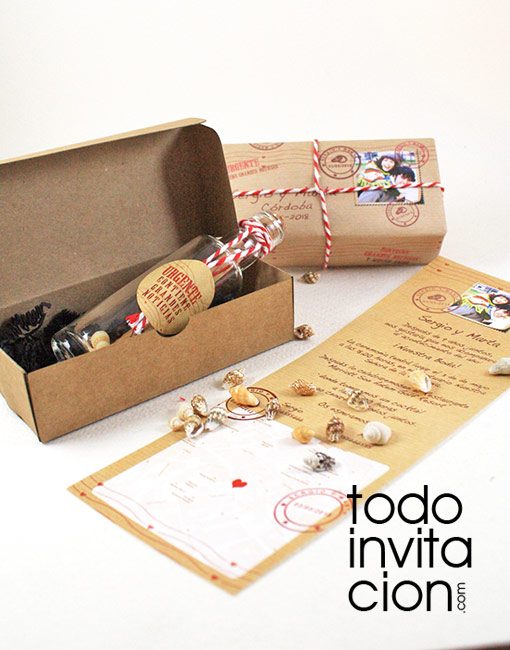 - Una invitación de boda muy original. ¡¡Mensaje en una botella!! Un mensaje ha llegado en una botella cruzando el planeta con el mejor mensaje del mundo: ¡Vuestra boda! En el interior de la botella un mensaje enrollado con el texto que vosotros nos mandéis y en el exterior de la cajita vuestros datos, nombres, fecha y vuestra foto como un auténtico paquete postal. Una invitación absolutamente espectacular.