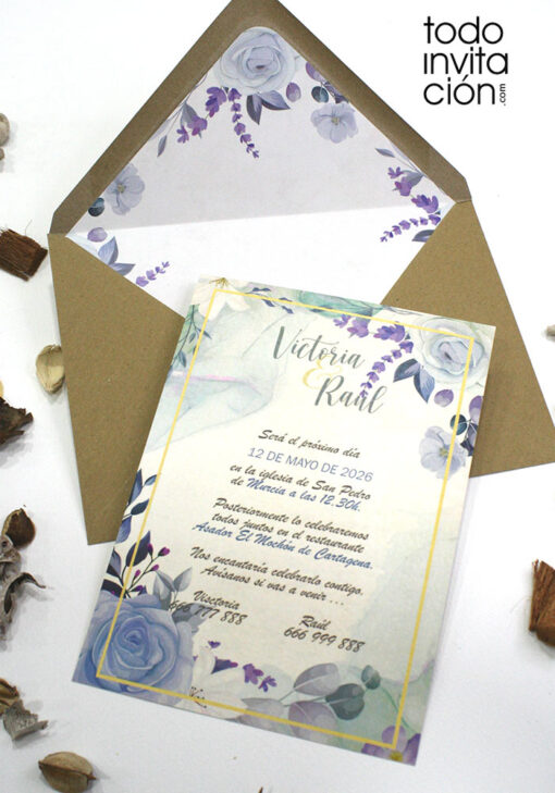 - Una original invitación original y muy romántica con una cuidada presentación VICTORIA impresa por ambas caras, con el texto que nos envíes y una decoración muy elegante y floral. Va impresa en papel grueso de algodón tipo acuarela con textura e incluye un elegante sobre de color o kraft o crema forrado por el interior a juego con tu invitación. Tarjeta algodón-acuearela 21 x 14 cm + sobre forrado a juego.
